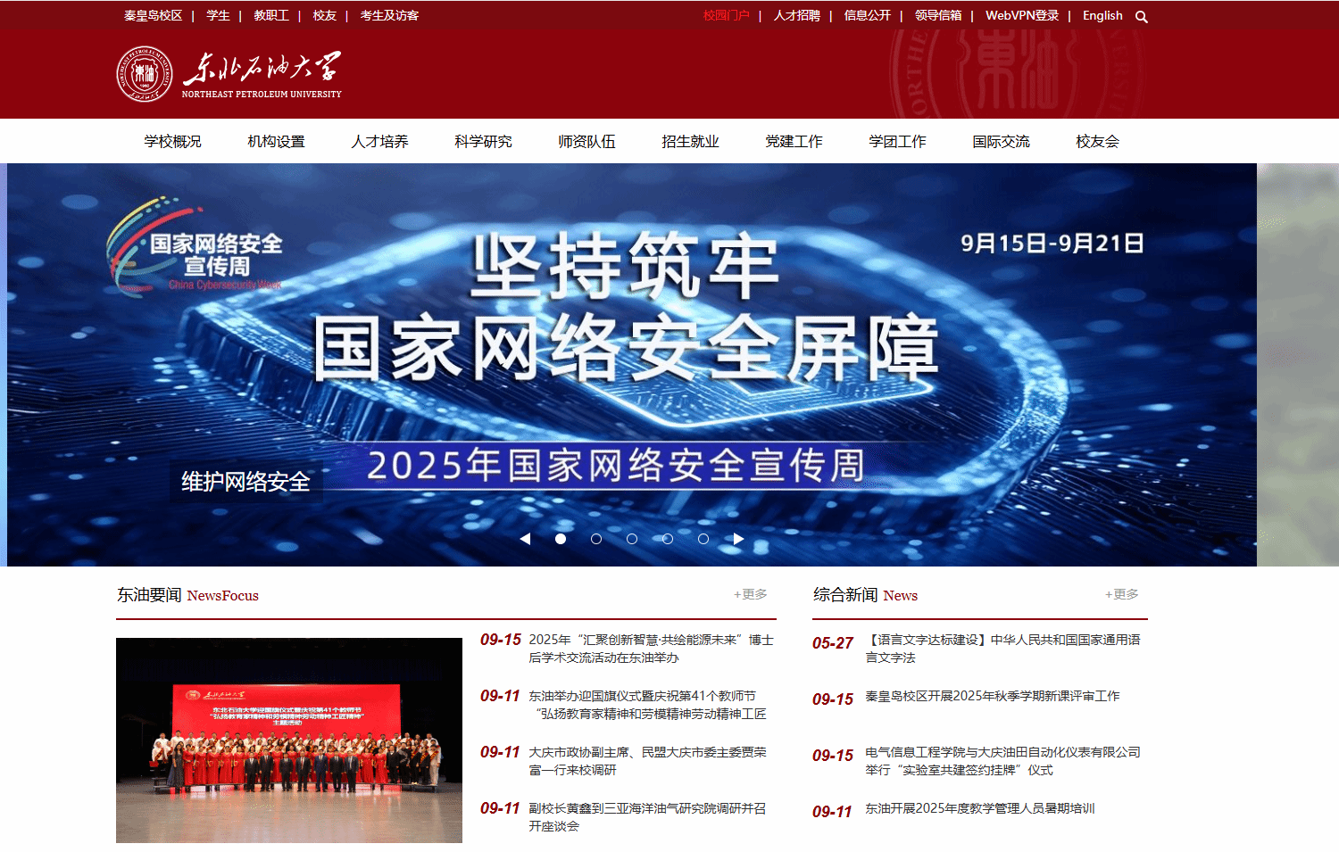 网络无边,安全有界。活动中,我校使用官网大图展示宣传,强化宣传力度;通过网络安全宣传周专题网站,广泛宣传《网络安全法》及国家网络安全成果;通过“东北石油大学”微信公众号等平台,发布网络安全倡议书等内容,从防范网络诈骗、个人信息保护、信息安全保密、人工智能安全等角度,向师生普及网络安全知识,推广网络安全技能。线下通过电子屏幕标语点亮全校楼宇、户外大屏,将网络安全宣传教育材料发放至师生手中,增强了师生的安全意识。