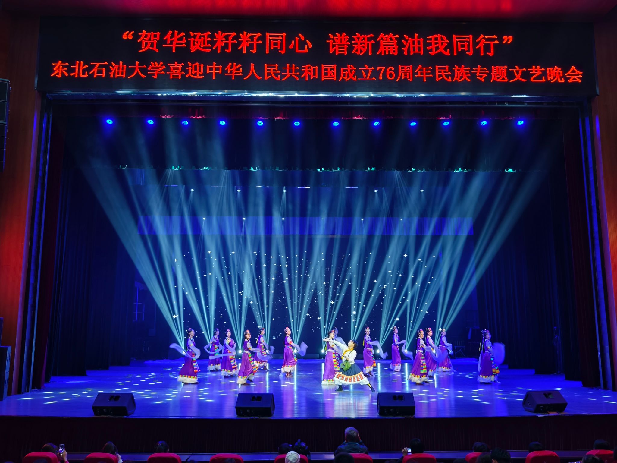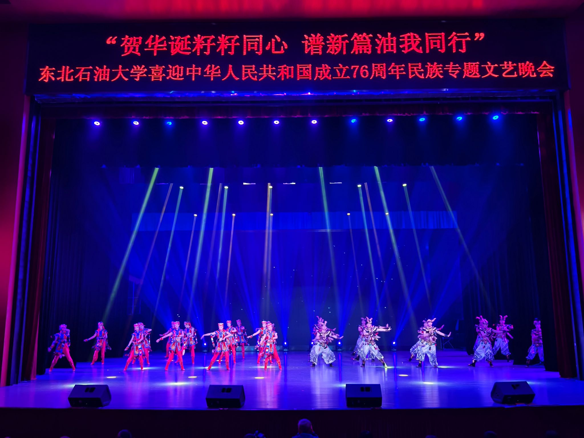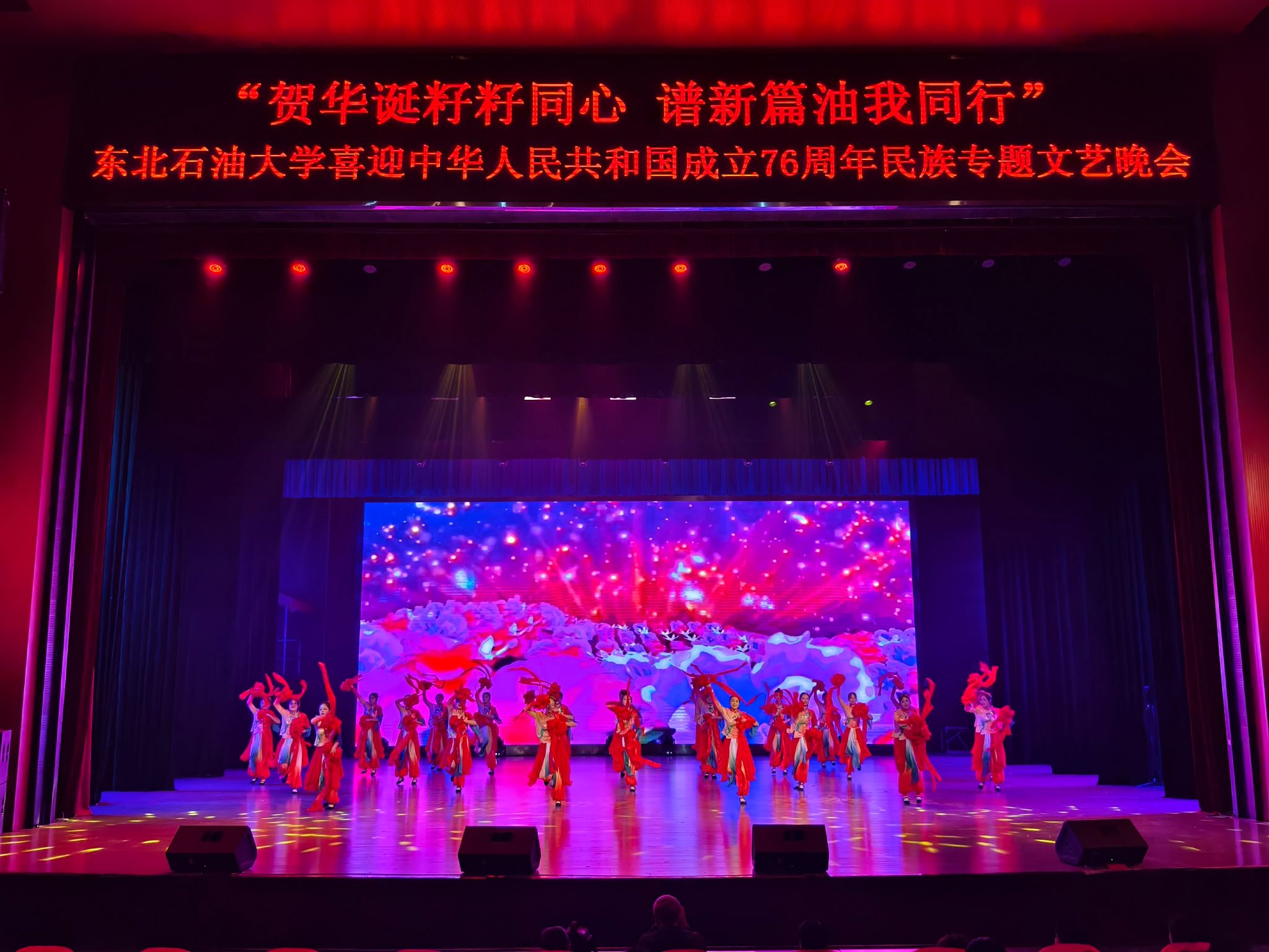 (通讯员 王书婷 记者/摄影 杨雨剑)为庆祝中华人民共和国成立76周年,深化民族团结进步教育,丰富“民族团结进步宣传月”活动内涵,9月27日晚,我校以“贺华诞籽籽同心 谱新篇油我同行”为主题,在音乐厅举办喜迎中华人民共和国成立76周年民族专题文艺晚会。校长董宏丽,校党委常委、组织部部长张智勇,校党委常委、宣传部部长徐清亮出席,校机关及二级学院相关负责人参加。本次晚会由党委统战部主办、大学生艺术团团总支承办、艺术学院协办,全校师生代表欢聚一堂,共赏民族文化盛宴,共话民族团结深情。
