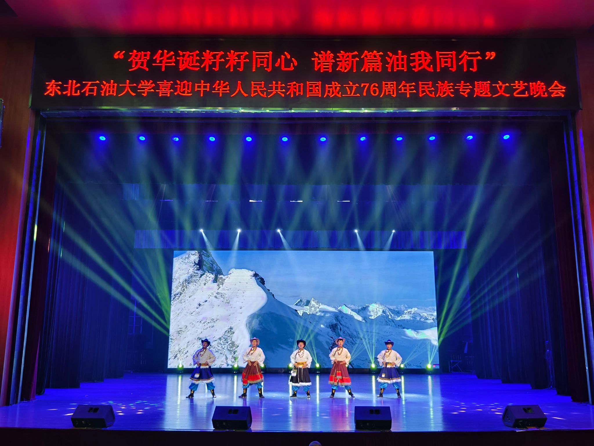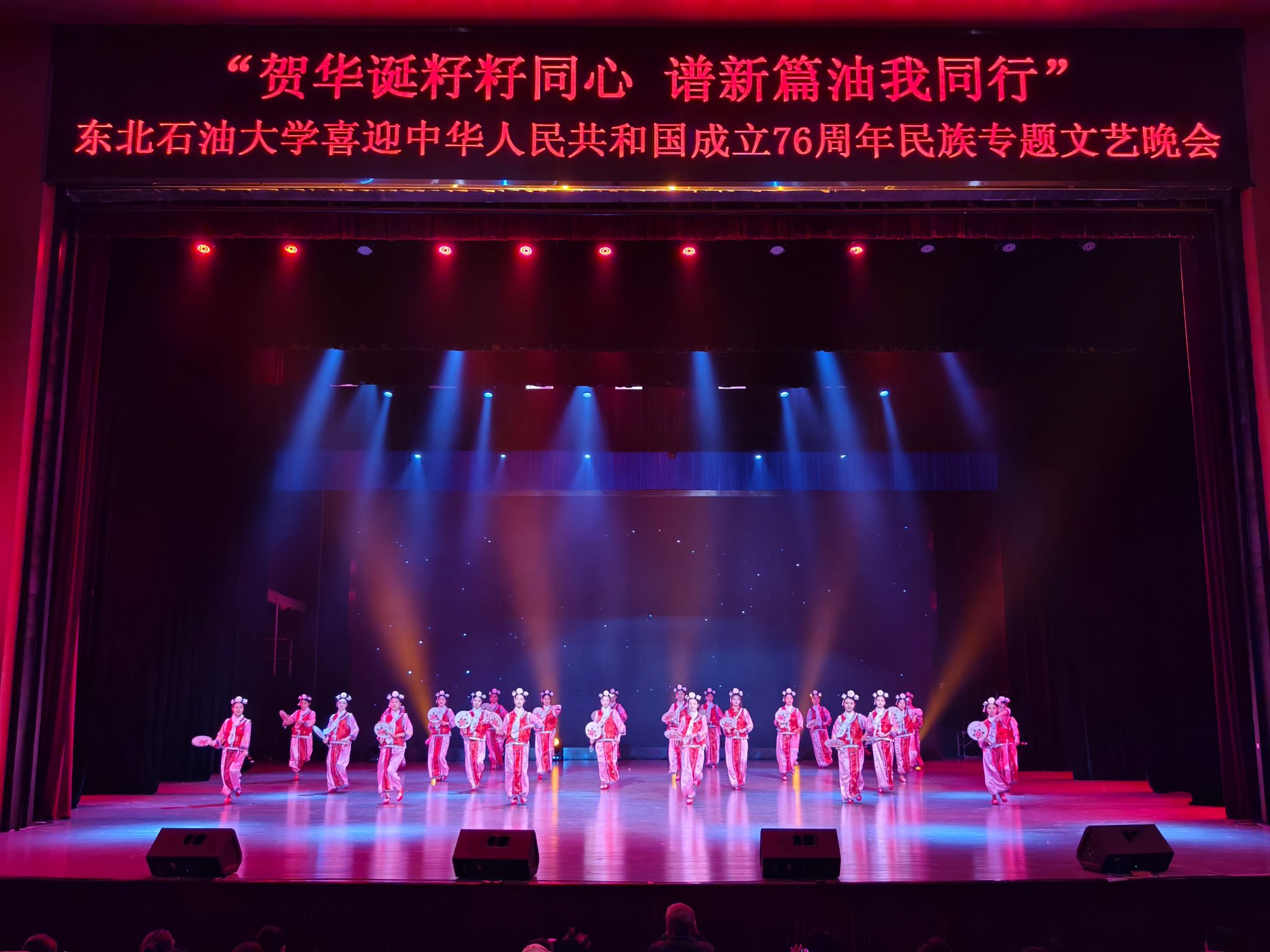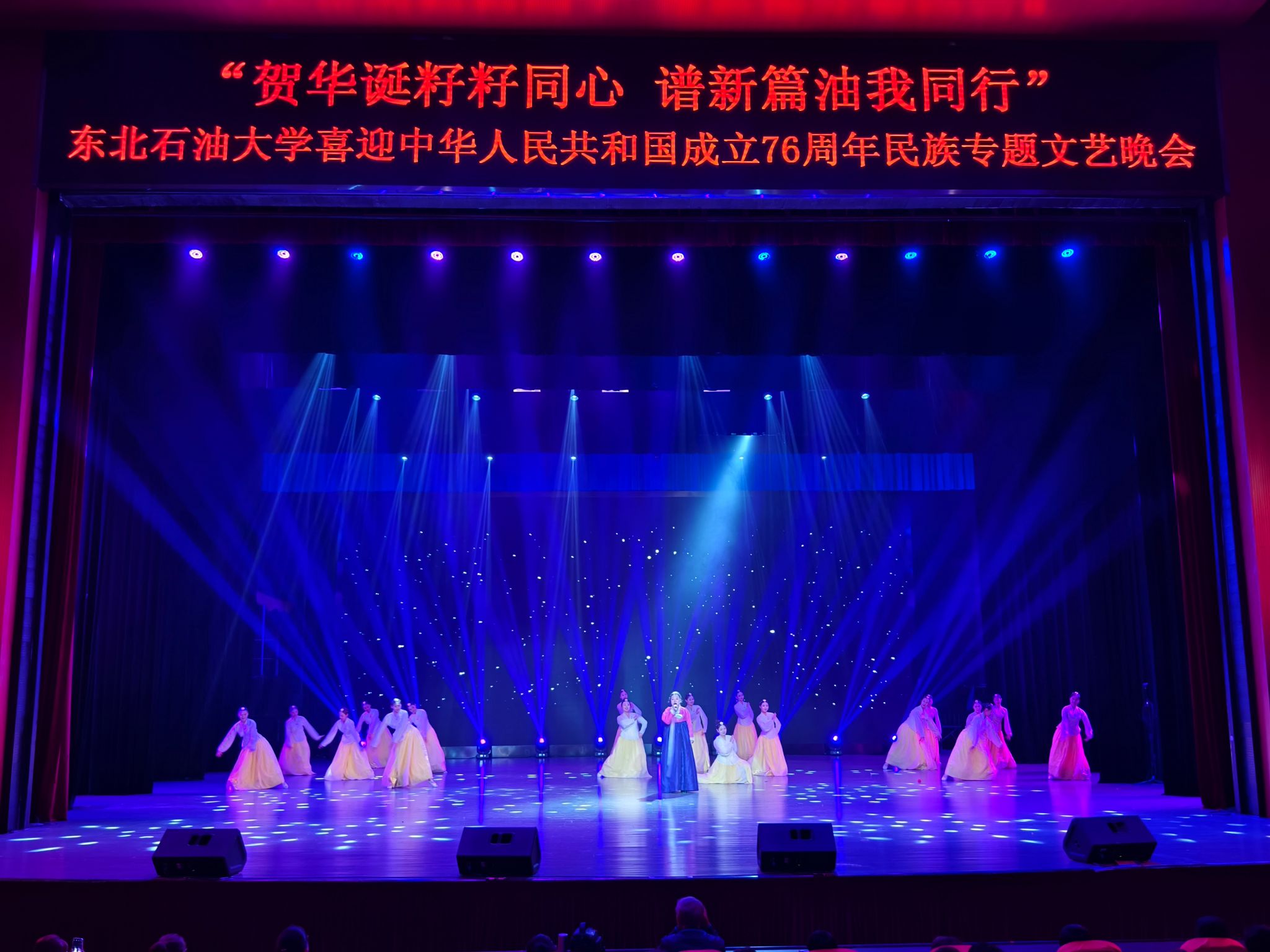 (通讯员 王书婷 记者/摄影 杨雨剑)为庆祝中华人民共和国成立76周年,深化民族团结进步教育,丰富“民族团结进步宣传月”活动内涵,9月27日晚,我校以“贺华诞籽籽同心 谱新篇油我同行”为主题,在音乐厅举办喜迎中华人民共和国成立76周年民族专题文艺晚会。校长董宏丽,校党委常委、组织部部长张智勇,校党委常委、宣传部部长徐清亮出席,校机关及二级学院相关负责人参加。本次晚会由党委统战部主办、大学生艺术团团总支承办、艺术学院协办,全校师生代表欢聚一堂,共赏民族文化盛宴,共话民族团结深情。